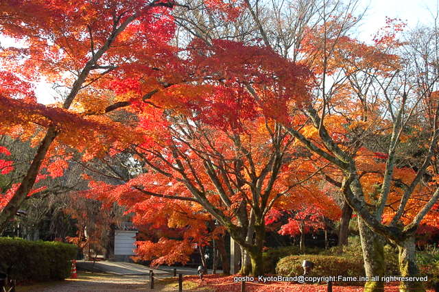 元寺務所跡であったという美山荘の小柄のモミジに挟まれた参道を進むと、峰定寺(ぶじょうじ)の山門を覆うかのように被さる真紅のモミジと、山門前の真緑の高野槙(こうやまき)の神木が目に飛び込んでくる。