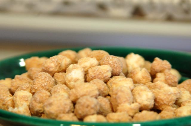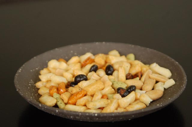 香ばしく甘辛い味がする。硬くなった鏡餅を細かく切り、黒豆と白豆とに混ぜ、炒った後砂糖醤油を塗(まぶ)した素朴なお菓子である。