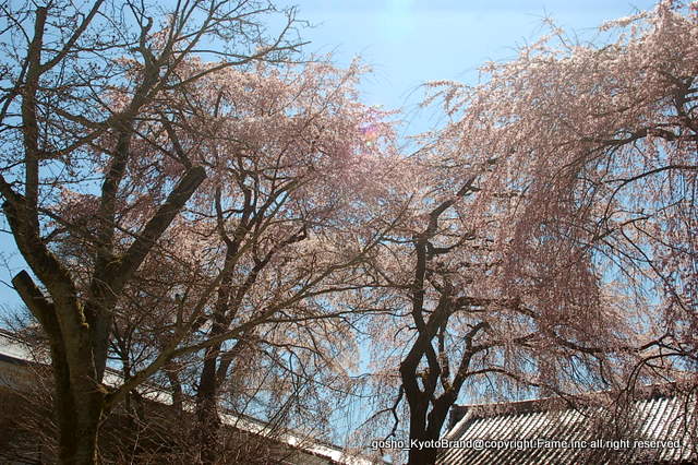 「京のへそ石」の右手にある枝垂桜の古木だ。長く立派な枝振りに衝立が施され、六角形の傘のように広がっている。996年、花山院前内大臣がこの桜を詠んだ時より「御幸桜」と呼ばれている。