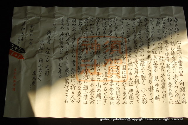 須賀神社の懸想文売りをイメージし、懸想文を授与して帰ることを思い出させてくれたのが、